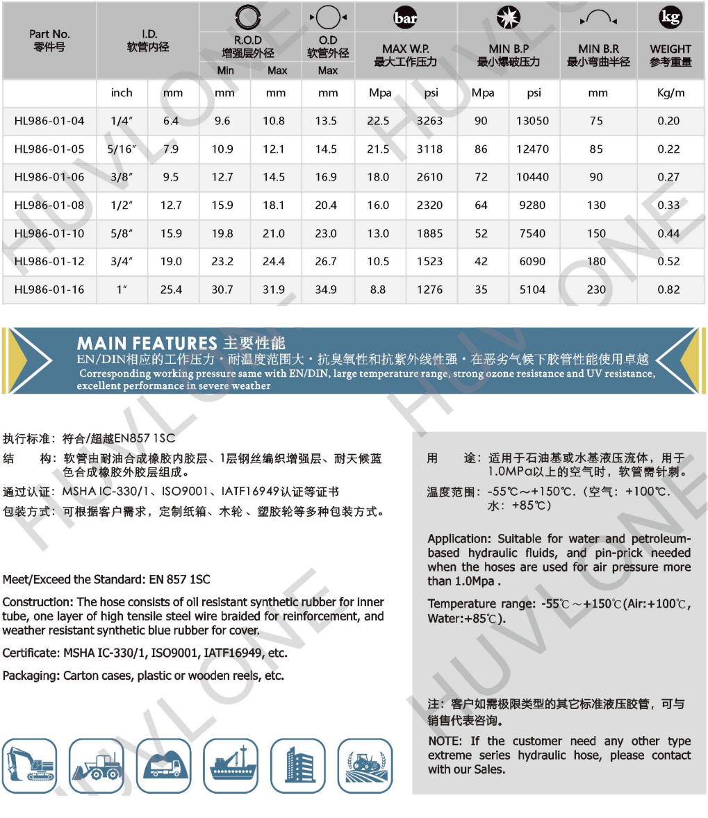 符合/超越DIN EN857一層鋼絲編織耐高低溫橡膠軟管