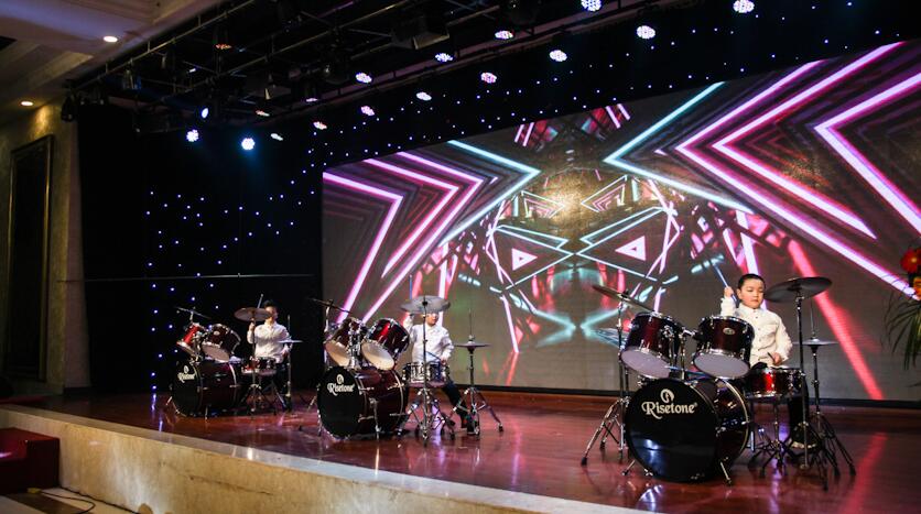 首先登場(chǎng)的是由小朋友們帶來活力十足的暖場(chǎng)架子鼓表演,配合著燈光和重金屬的節(jié)奏,令現(xiàn)場(chǎng)的粉絲們?nèi)繗g呼起來。